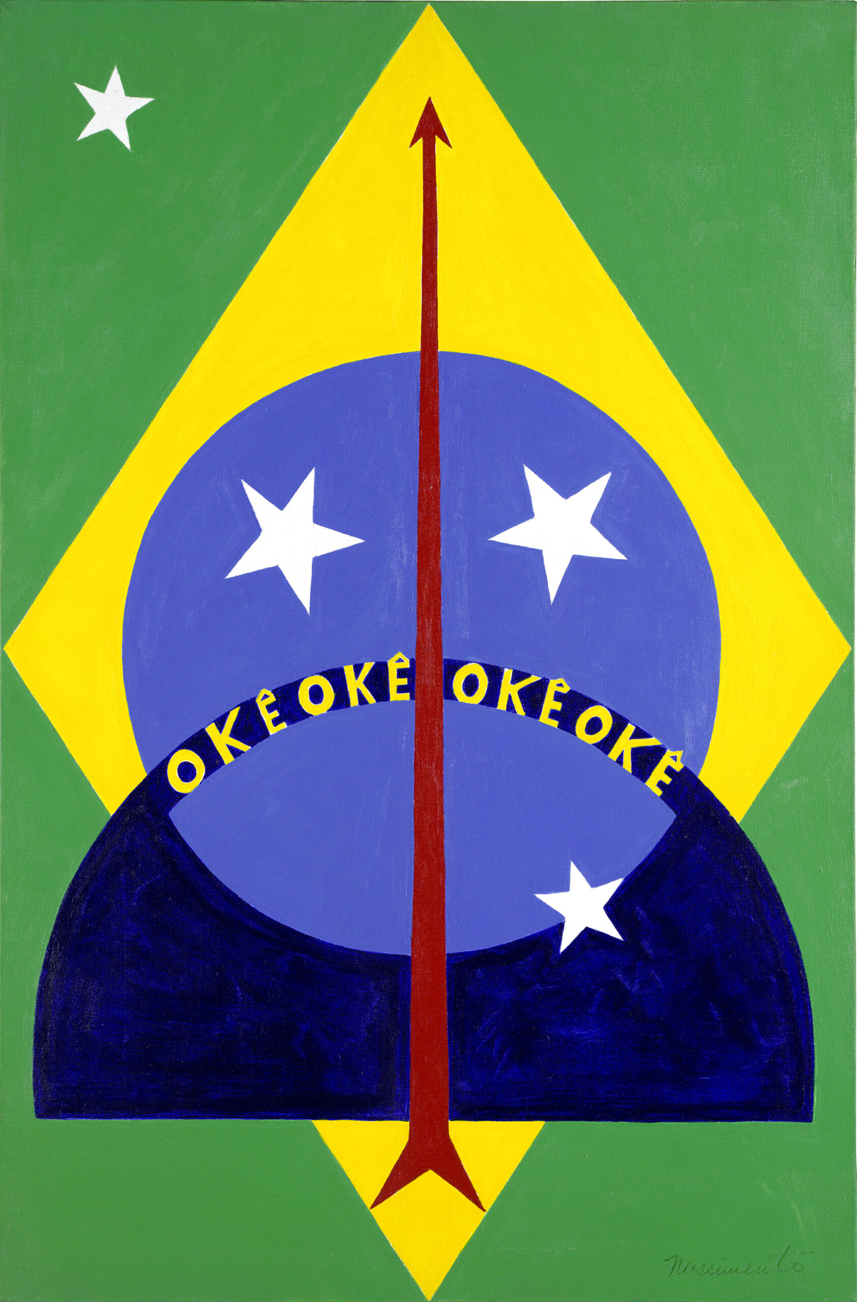A pintura Okê Oxóssi, doada ao MASP pelo Ipeafro em 2018, é um exemplo da síntese poderosa entre arte e ativismo proposta por Abdias: nela, a bandeira do Brasil é reinventada com a saudação ao orixá Oxóssi, propondo um novo pacto simbólico para o país — um Brasil onde as culturas negras estejam no centro da construção nacional.